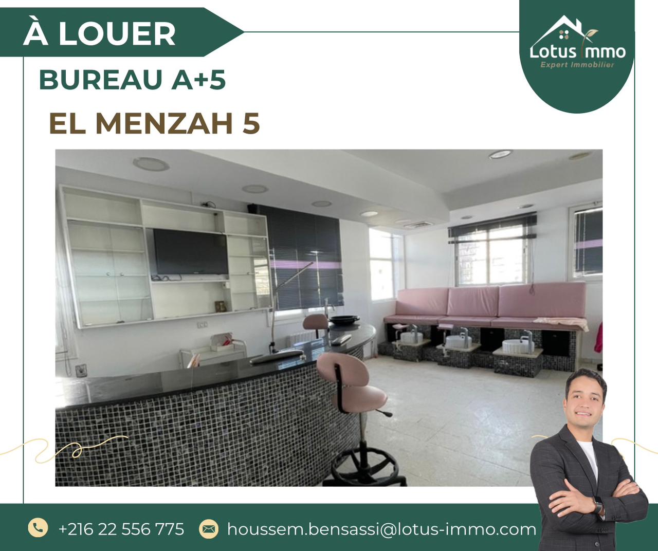 Nous vous proposons à la location un bureau professionnel de type A+5, idéalement situé à El Menzah 5, sur une artère principale très fréquentée, offrant une excellente visibilité et une accessibilité optimale.