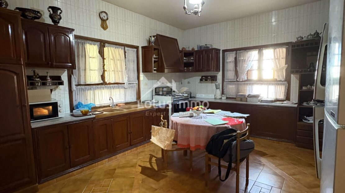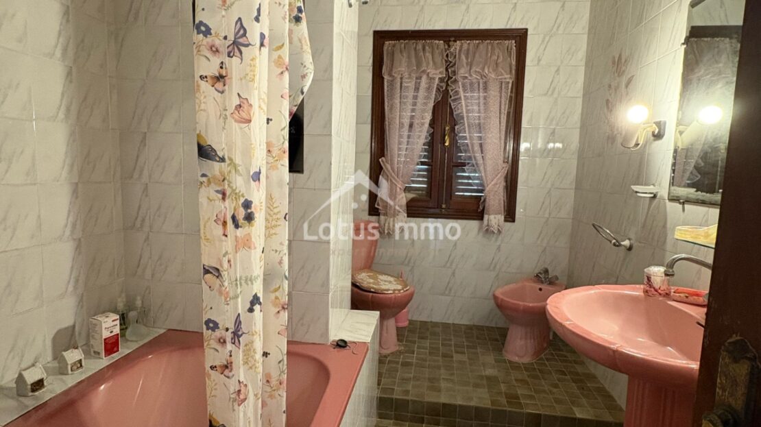 À l’extérieur, la villa est entourée d’un jardin sur les quatre côtés, offrant un bel espace vert avec la possibilité d’aménager une piscine. Le bien dispose également du chauffage central, d’un grand garage et d’un dossier juridique complet et à jour.
