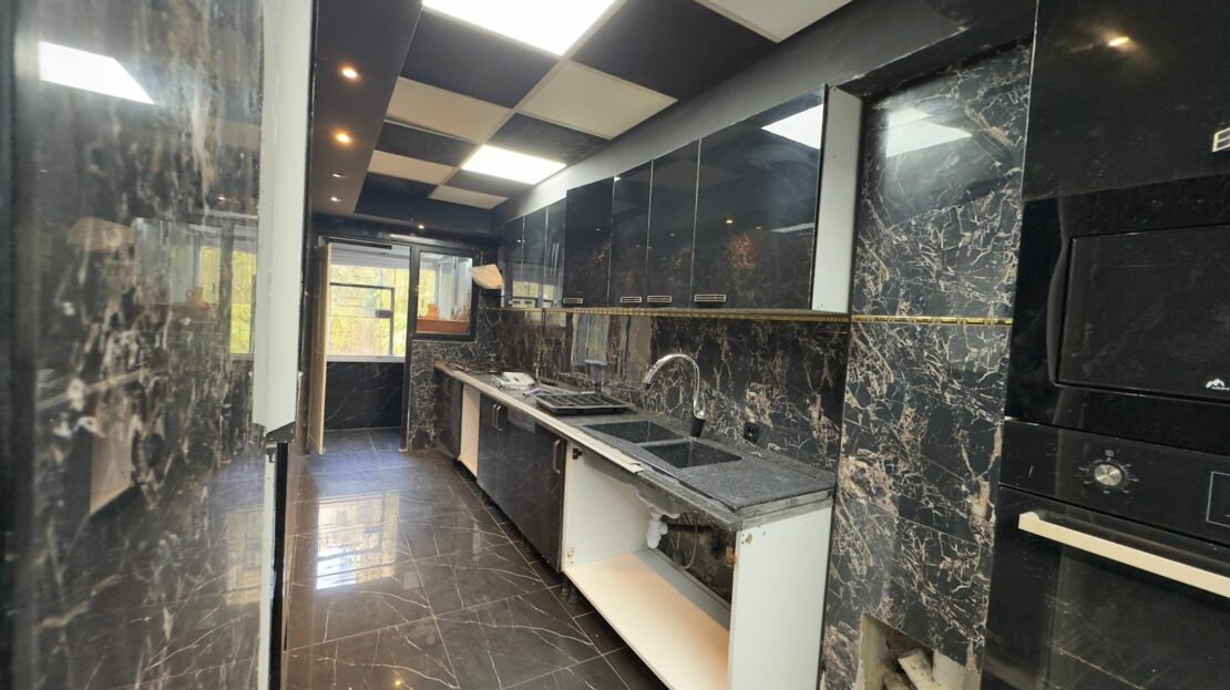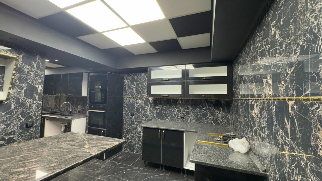 - Cuisine moderne entièrement équipée, habillée de marbre avec rangements sur mesure
